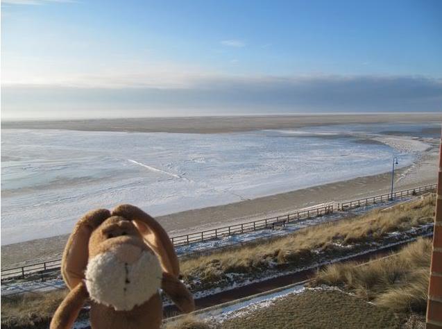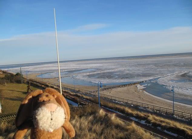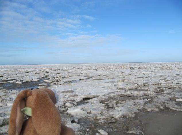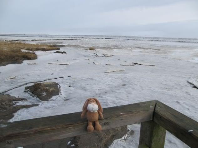 Hello from Amrum, Yesterday we arrived in Wittdün. This morning we went onto our balcony and had a look around. Well – normally there is water – but now there was ice.