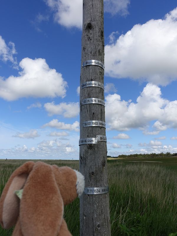 Auf dem Rückweg zum Auto sind wir an diesem Pfahl vorbeigekommen – so hoch waren die Fluten früher.