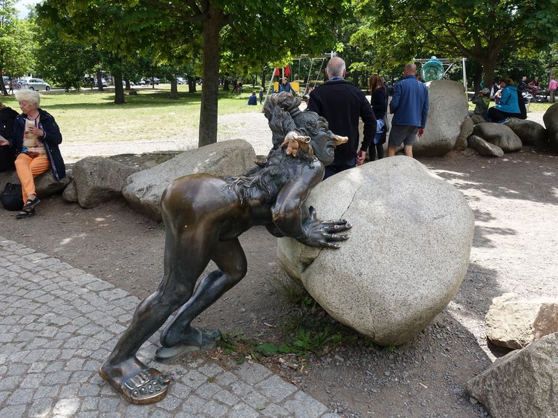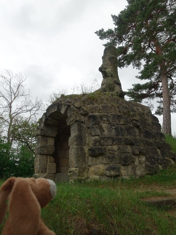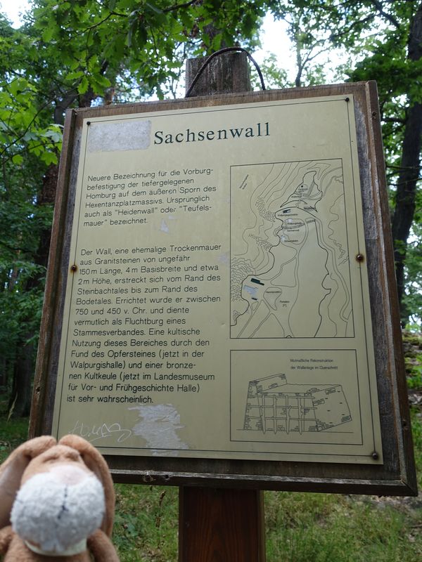 Oben auf dem Berg gibt es den Hexentanzplatz. Um ihn herum sind lustige Figuren.