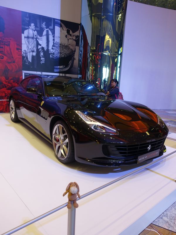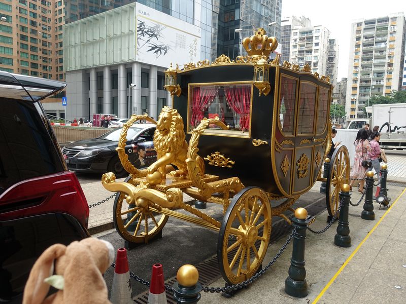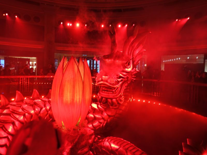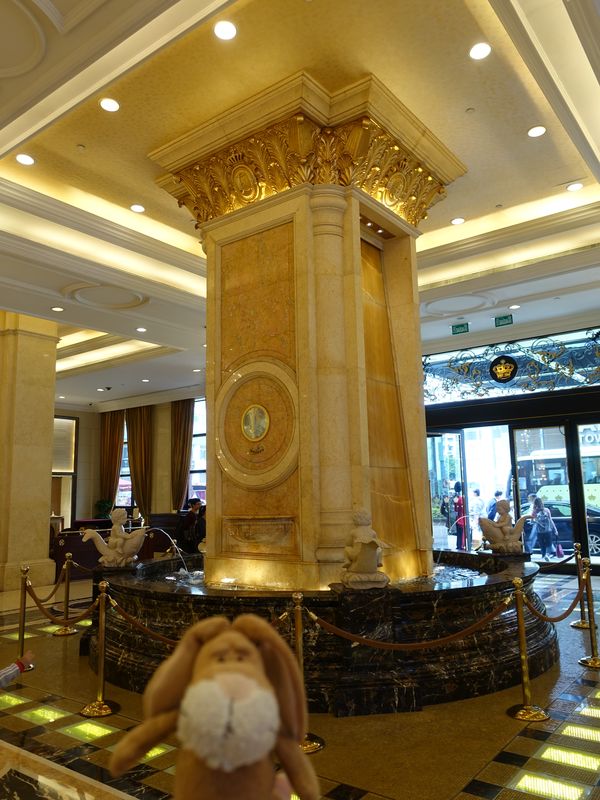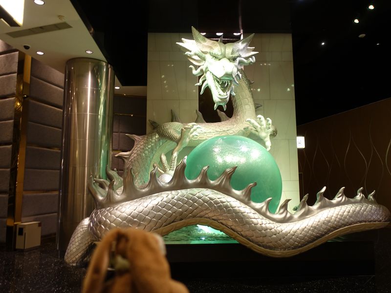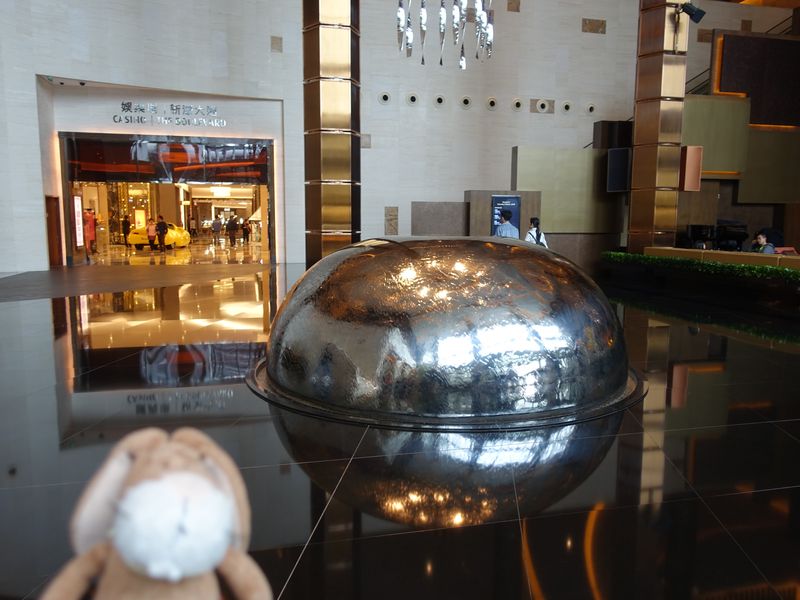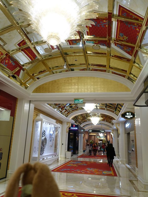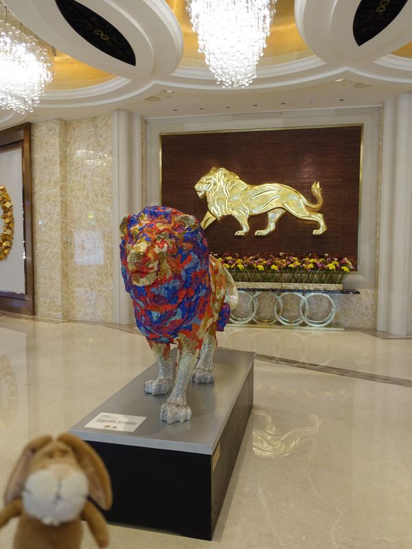 Im Atrium steigt der Dragon of Fortune jede Stunde empor. Wir sind gespannt. Die Decke ist toll – sie zeigt die Tiere aus dem chinesischem Horoskop. Der Hase war am schönsten.