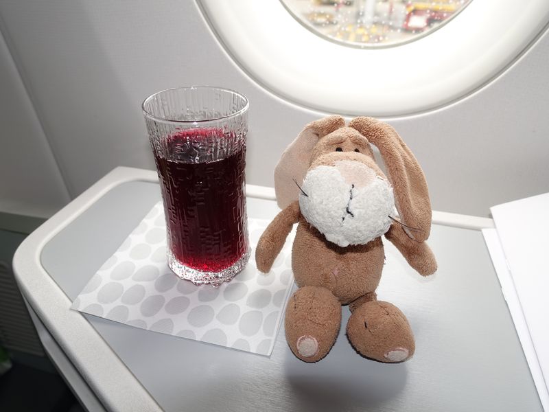 Nach einer letzten Nacht im Hotel bin ich wieder mal in ein Flugzeug gestiegen. Hier war das Begrüßungsgetränk.
