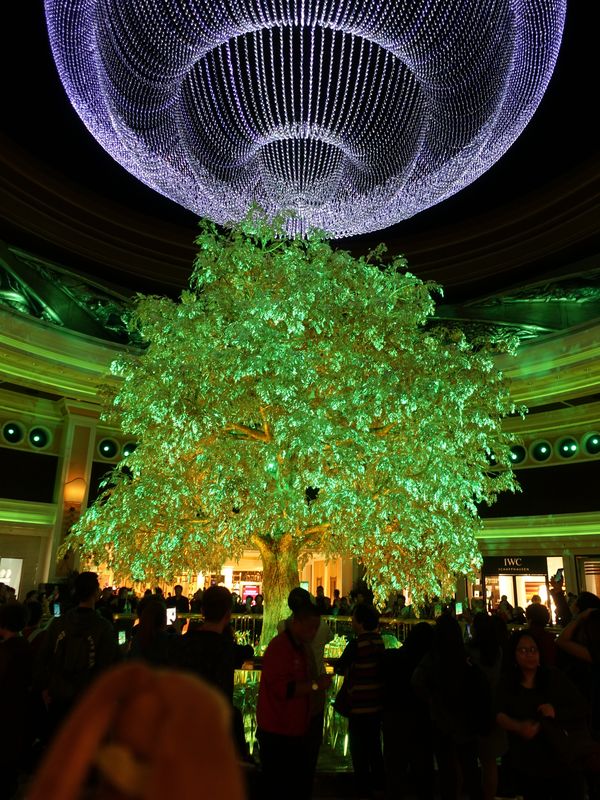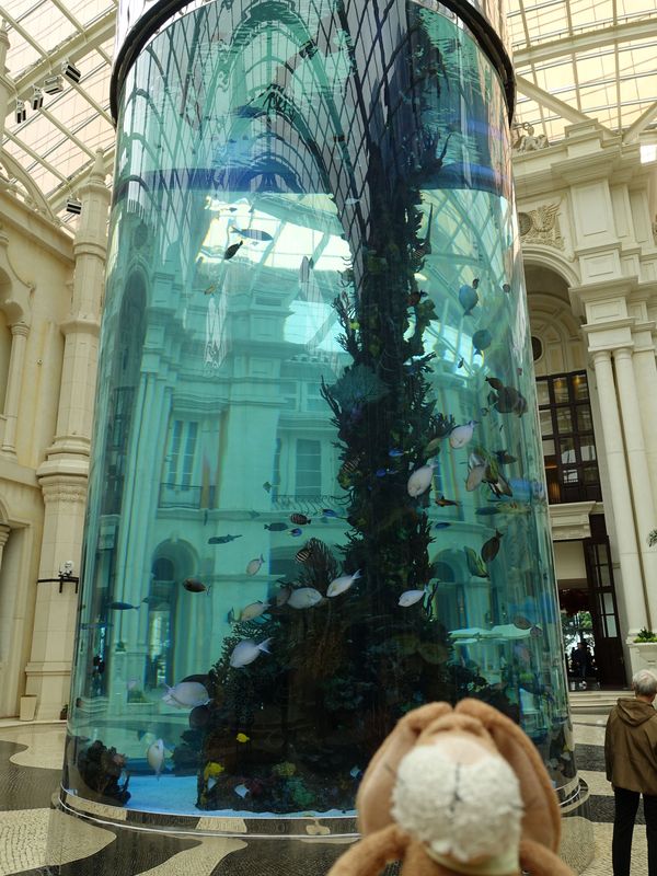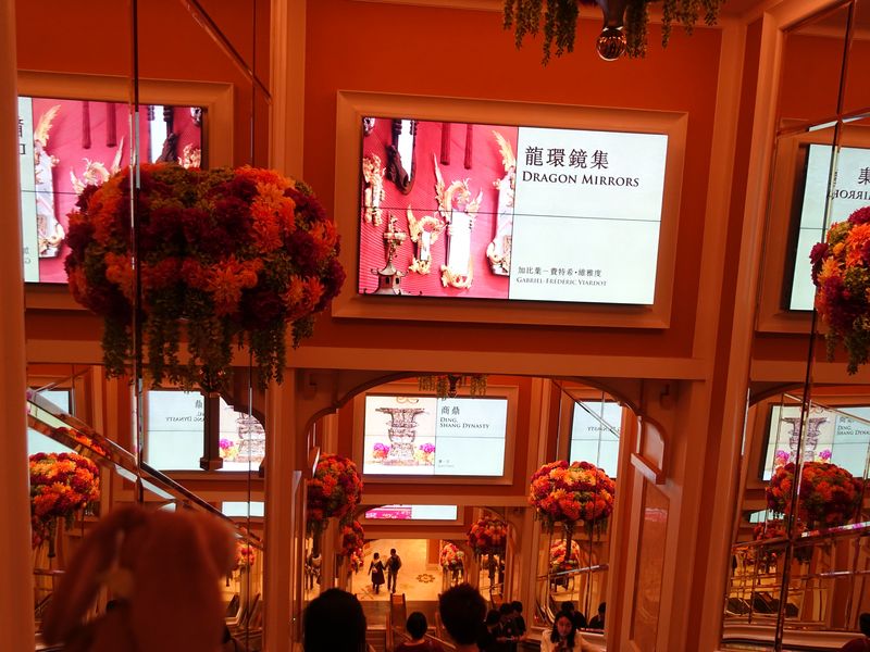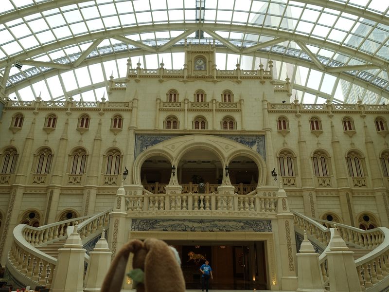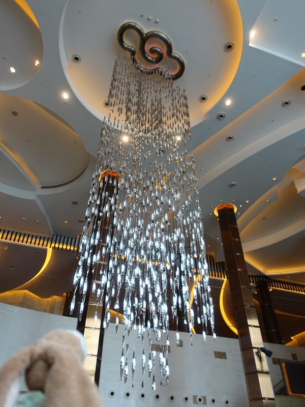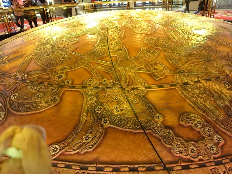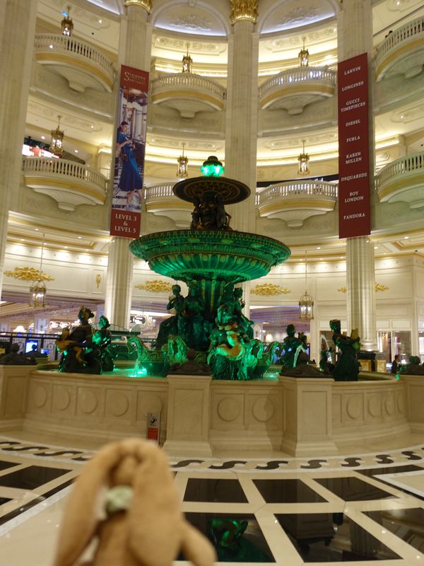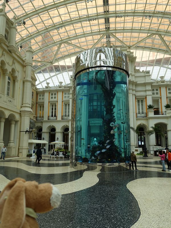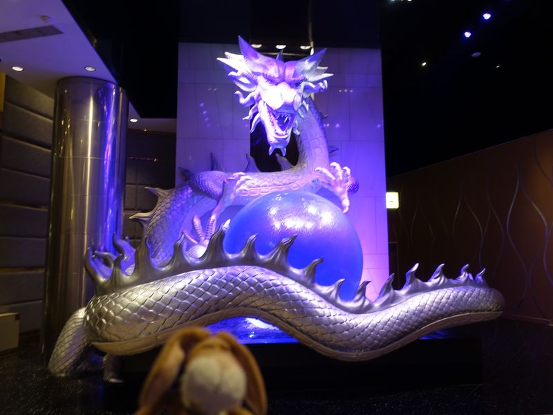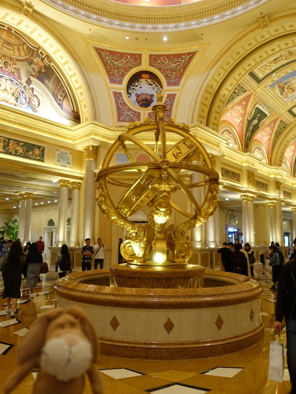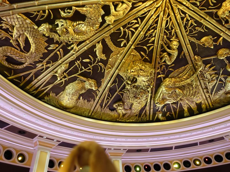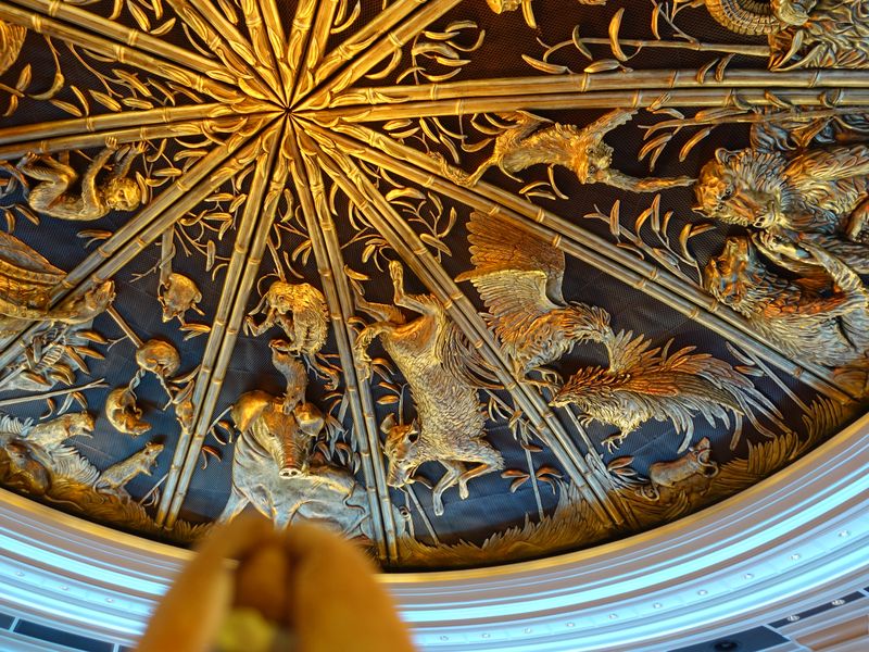 Im Atrium steigt der Dragon of Fortune jede Stunde empor. Wir sind gespannt. Die Decke ist toll – sie zeigt die Tiere aus dem chinesischem Horoskop. Der Hase war am schönsten.
