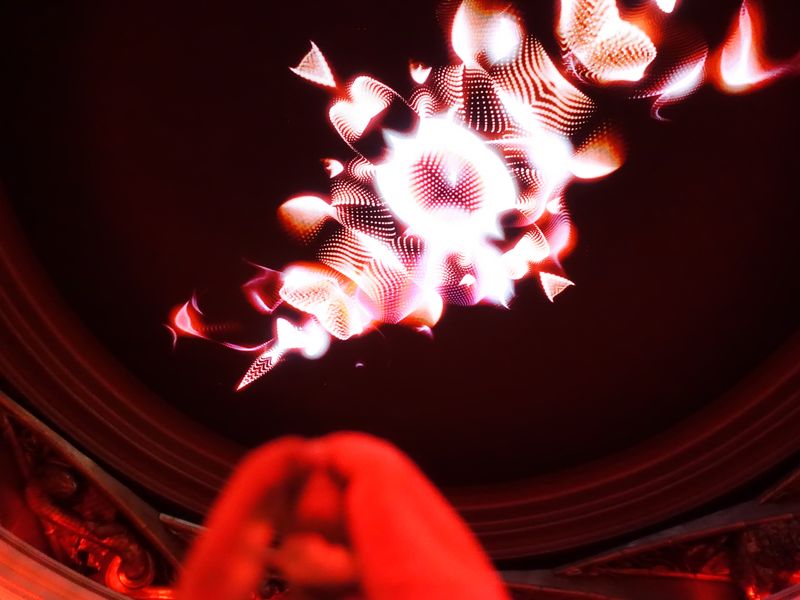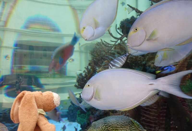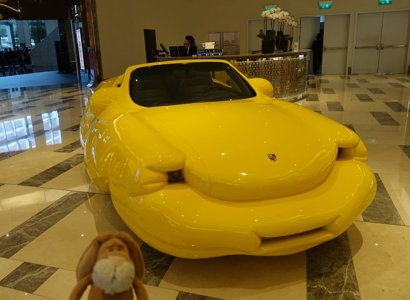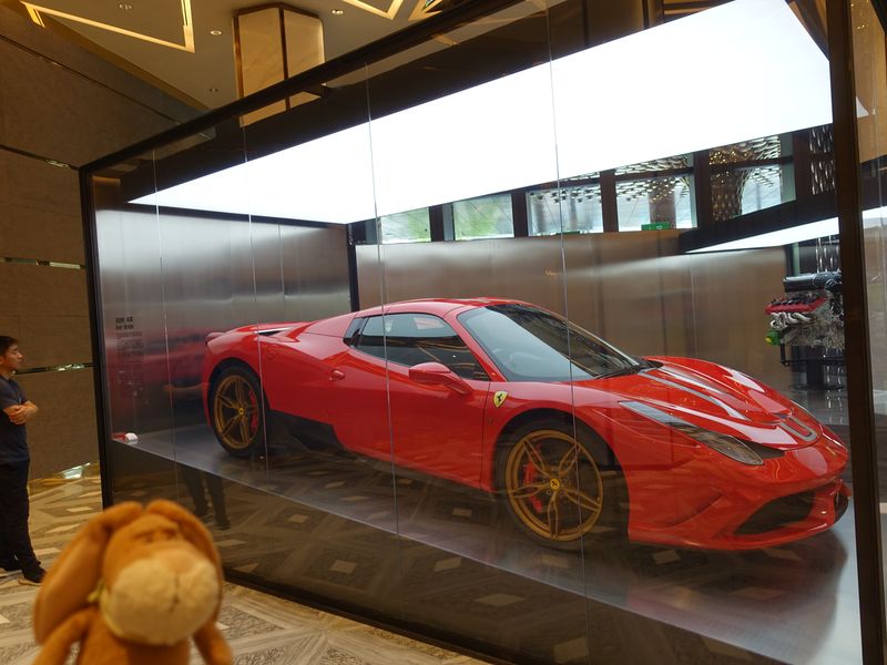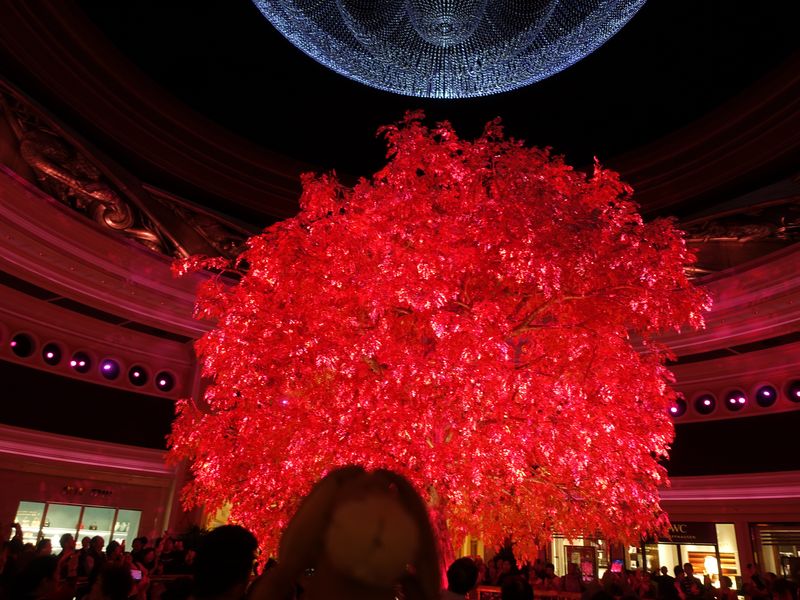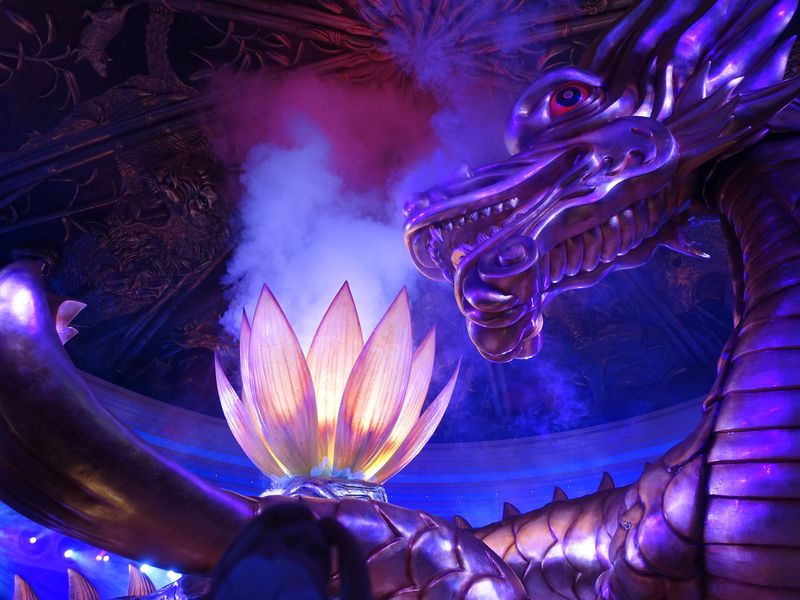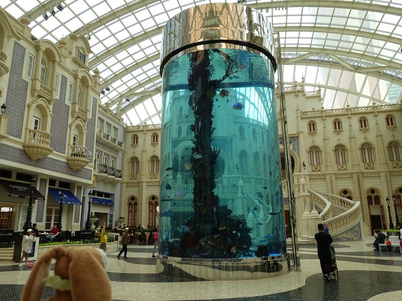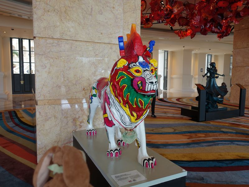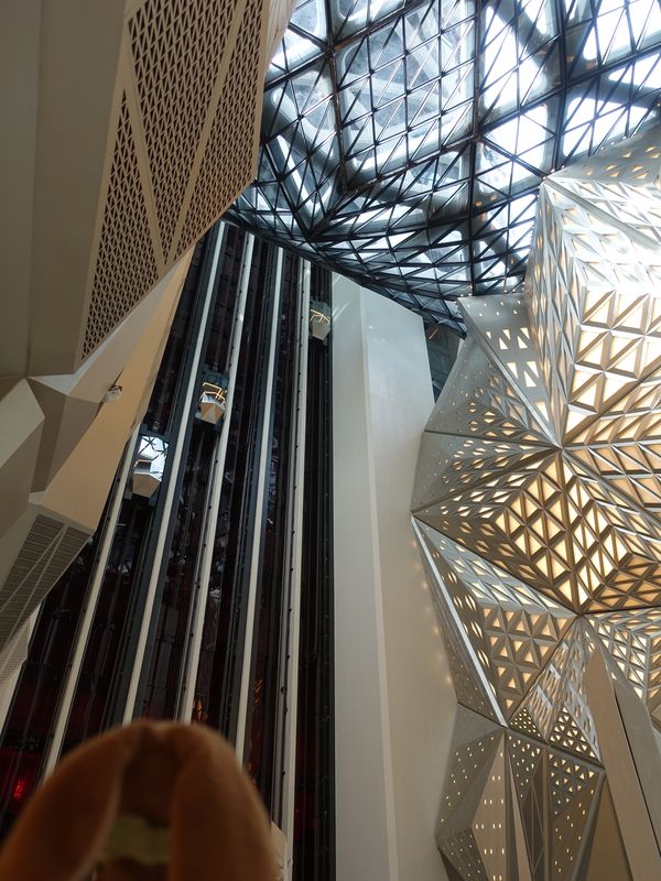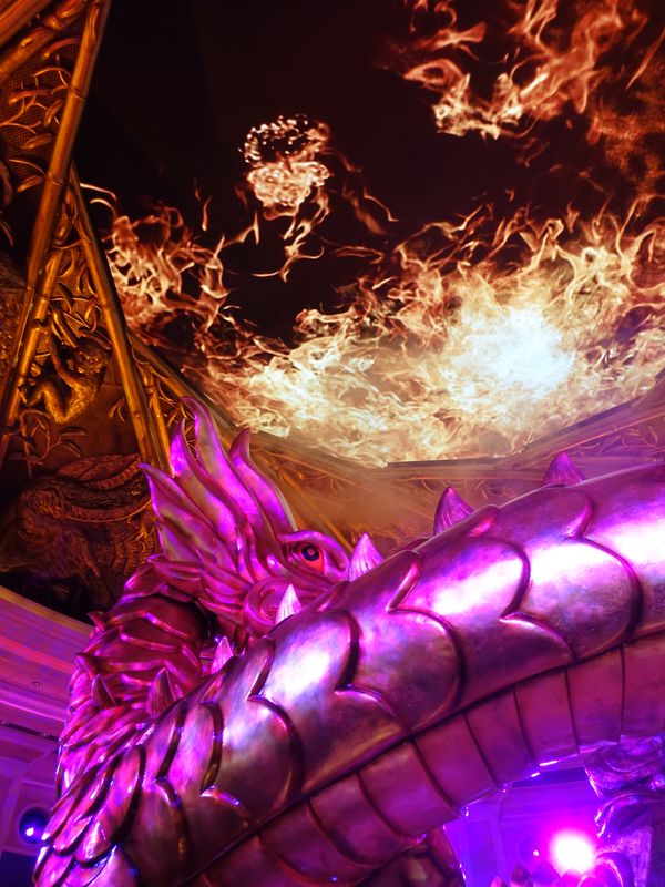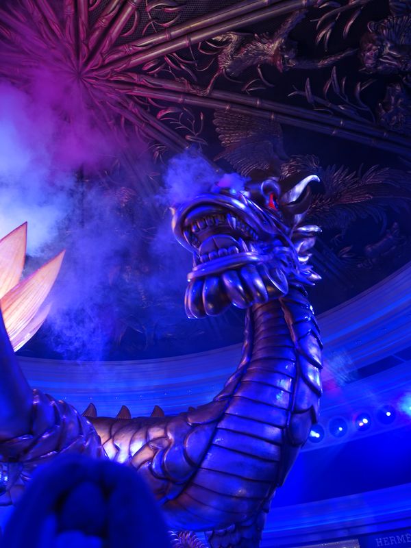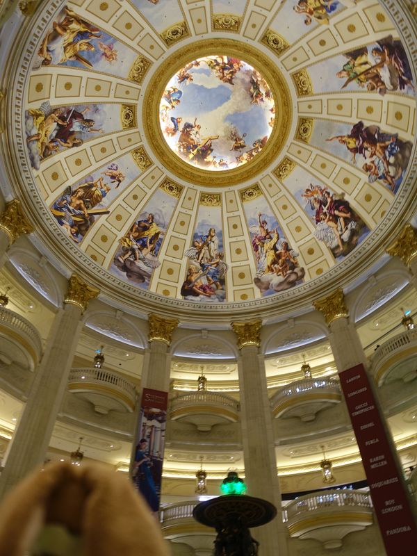 Im Atrium steigt der Dragon of Fortune jede Stunde empor. Wir sind gespannt. Die Decke ist toll – sie zeigt die Tiere aus dem chinesischem Horoskop. Der Hase war am schönsten.