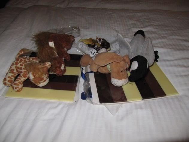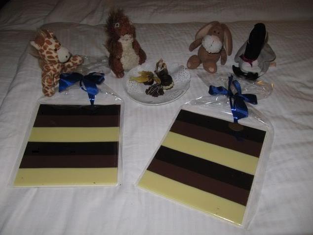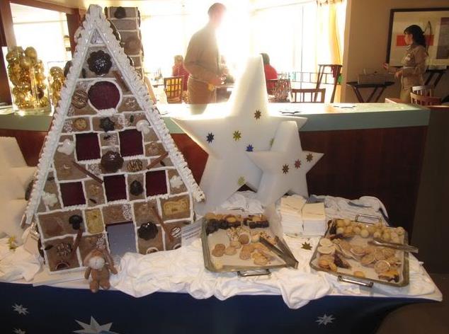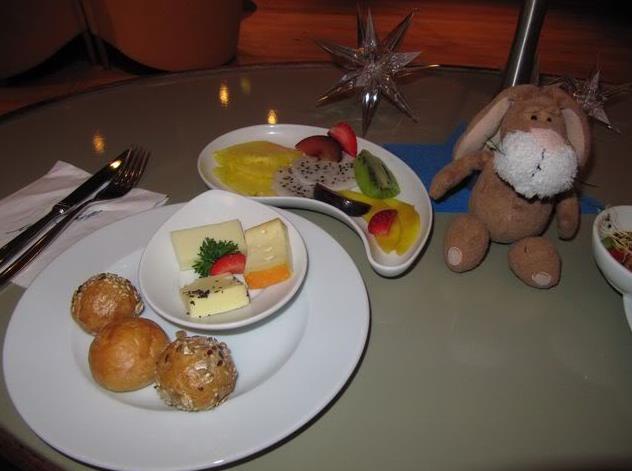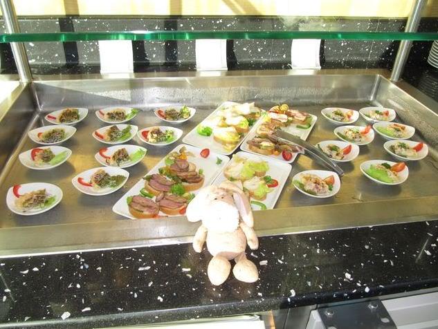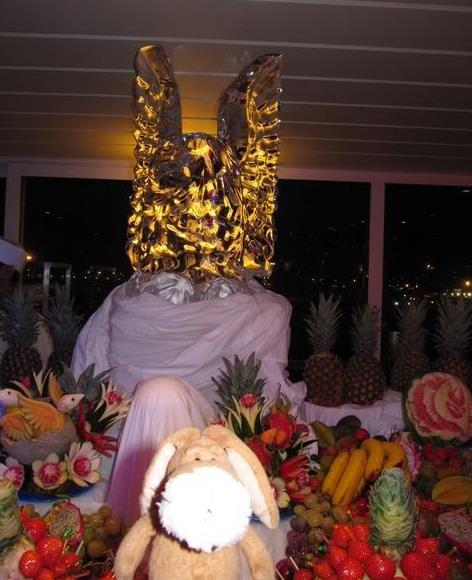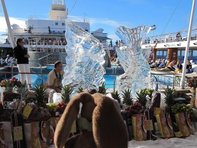 In the evening we went to the buffet. There were fruits with chocolate and ice sculptures.