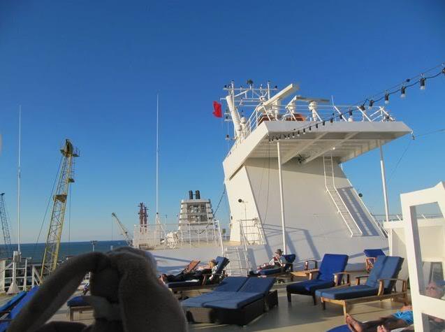 At the beginning of a cruise there is always a test for an emergency – so all people and ToyVoyager on board know, what to do. Here I am with the lifejacket and Sqizzle, because we are so small we can take one together.