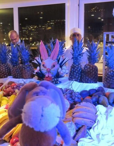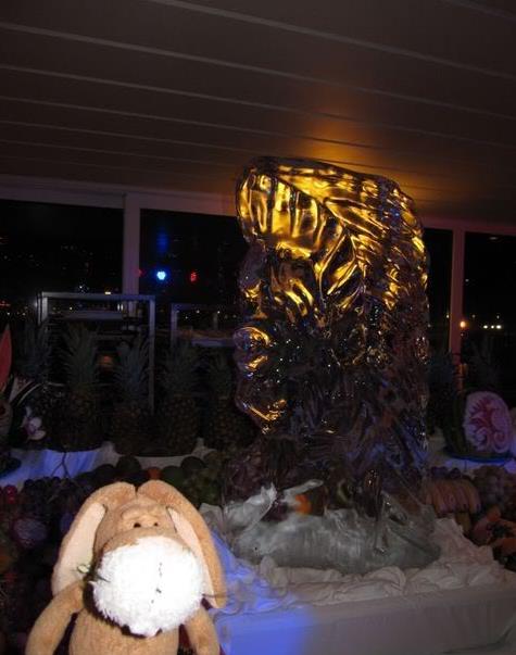 In the evening we went to the buffet. There were fruits with chocolate and ice sculptures.