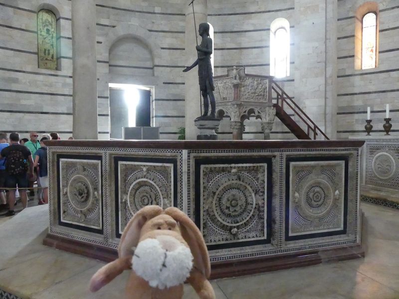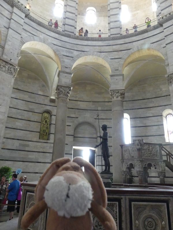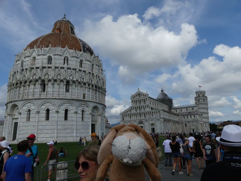 Endlich bin ich in Pisa, hier wollte ich schon immer hin. Außer uns hatten noch viele andere Leute den Einfall – aber es war genügend Platz für alle. Hinter mir siehst Du die tollen Gebäude auf dem Platz der Wunder. Das Gebäude links ist die Taufkirche – übrigens die größte Taufkirche der Welt.