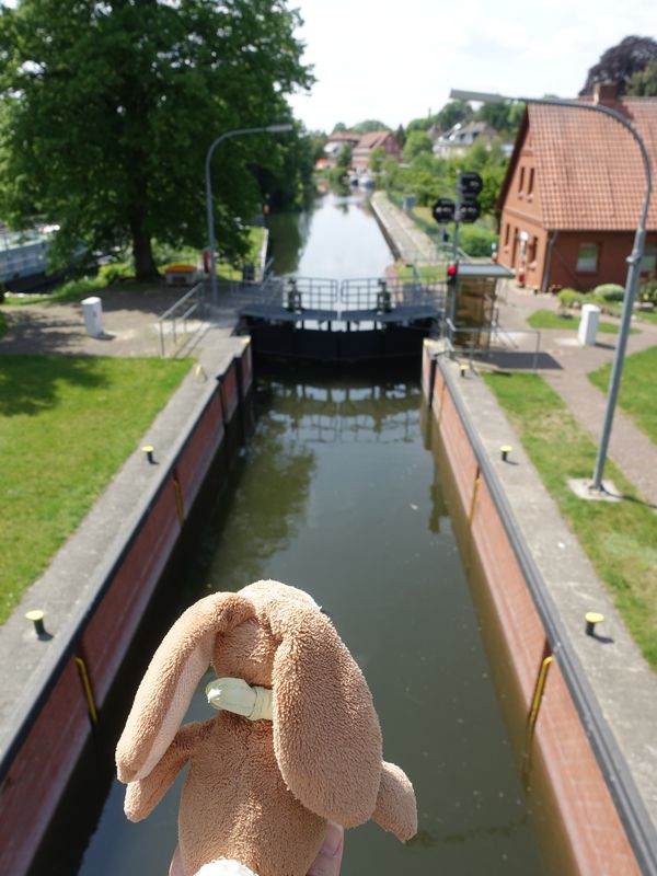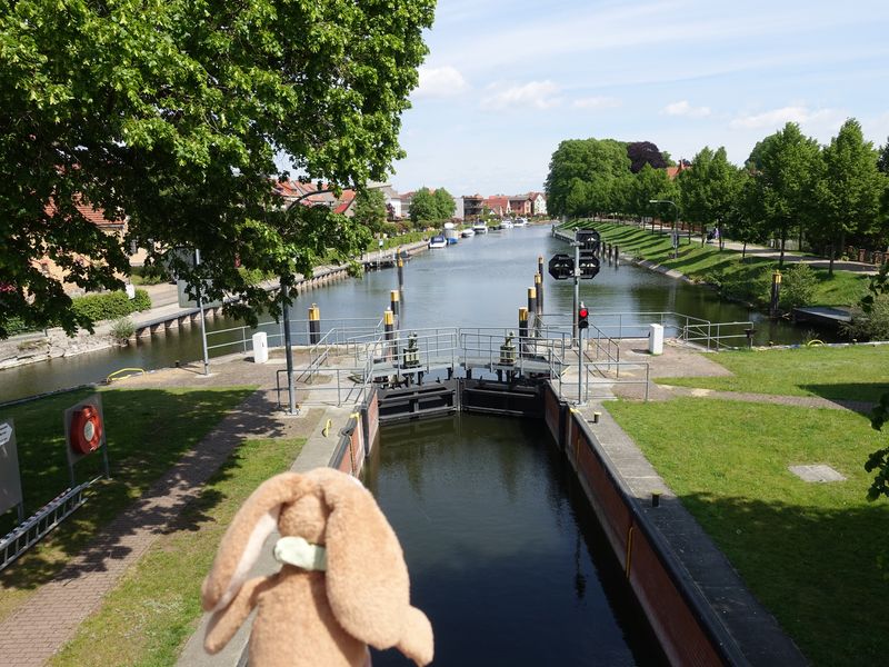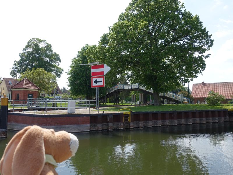 Jetzt wird es spannend – die Brücke heißt Hühnerleiter. Von dort kann man gut in die Schleuse schauen.