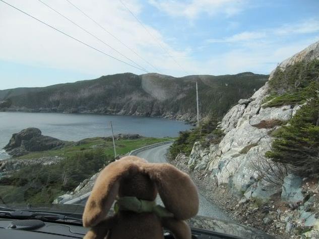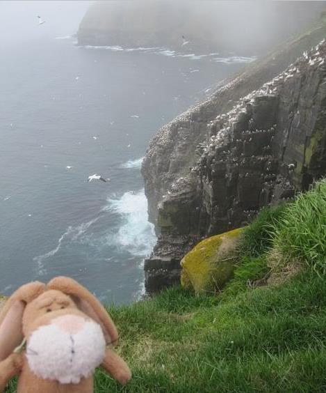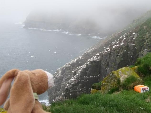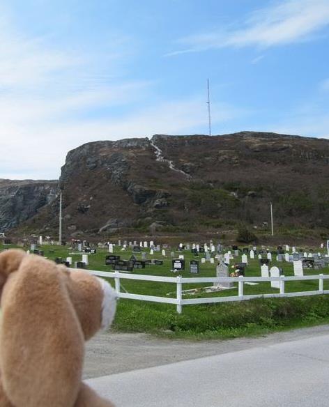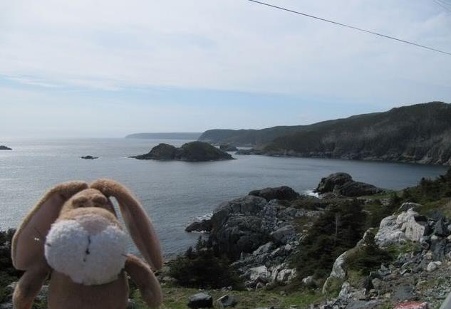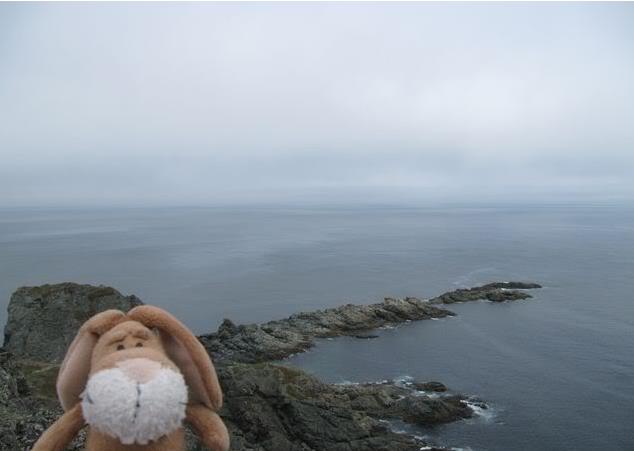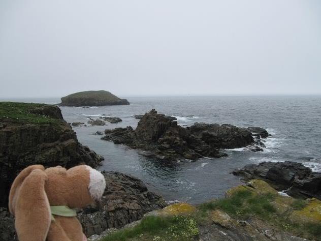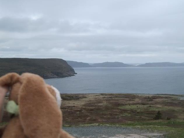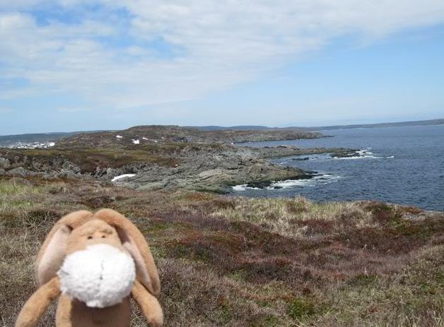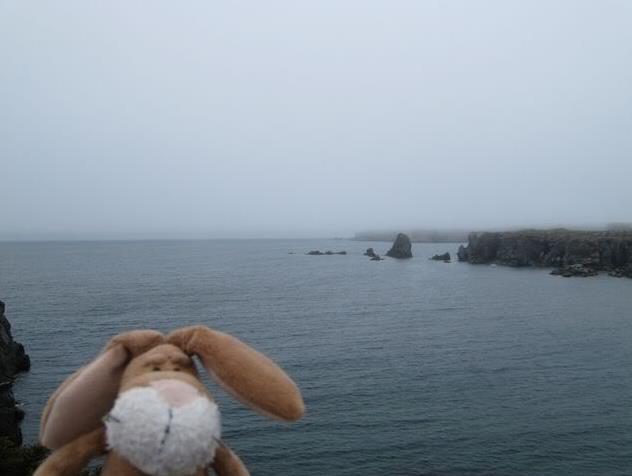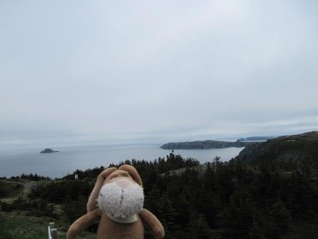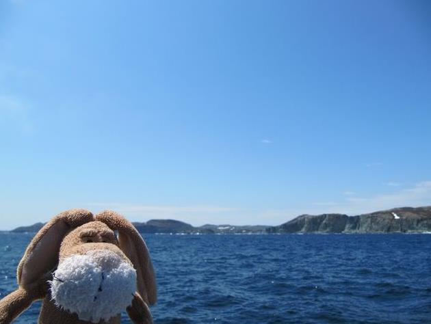 Hello from Bonavista, We were in Bonavista. On our way we stopped at a cliff, where puffins are living. They are so cute and funny. We saw a lot of them, sitting there and flying around, but they were far away. You can see the black and white dots on the photo behind me : there were the puffins.