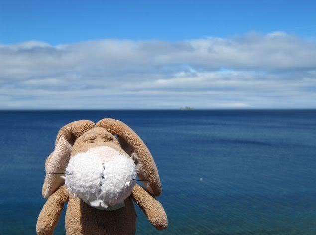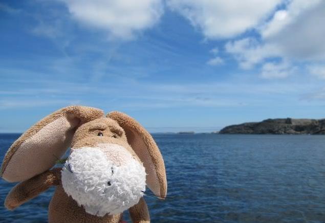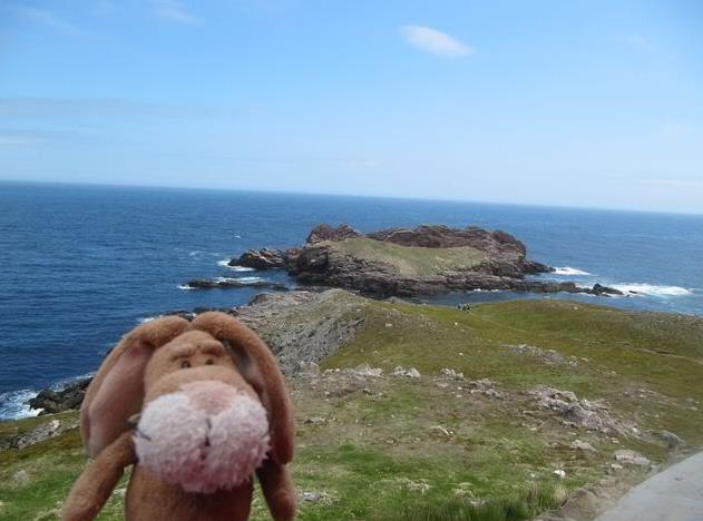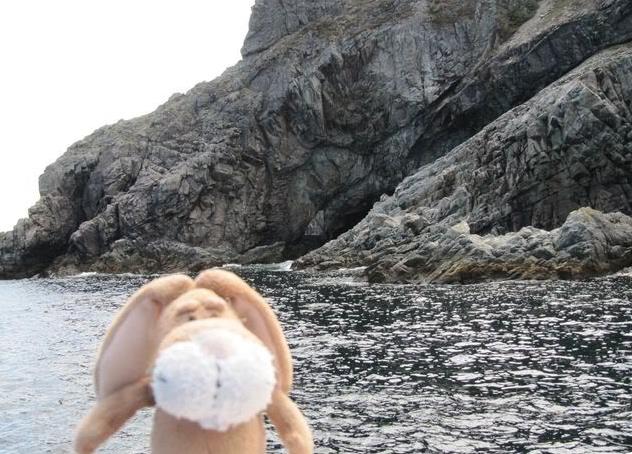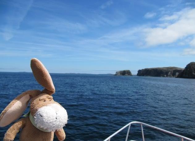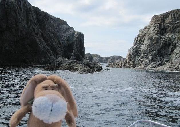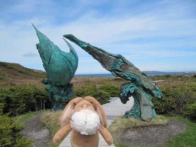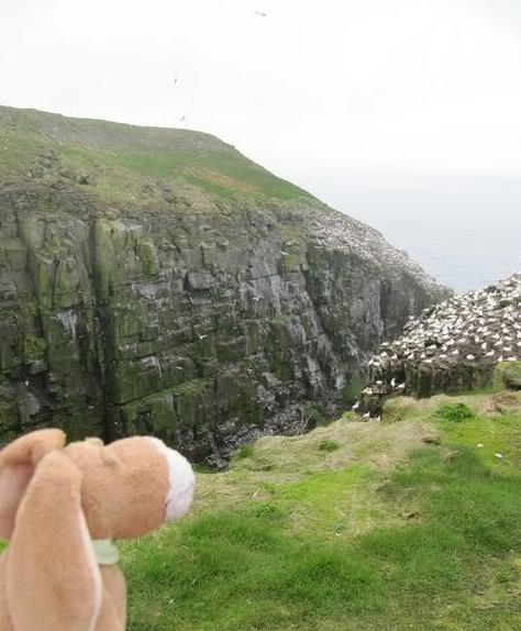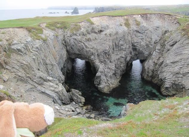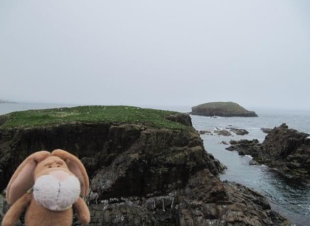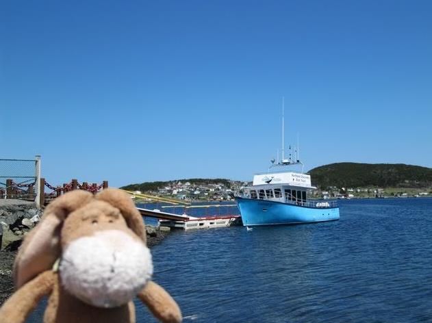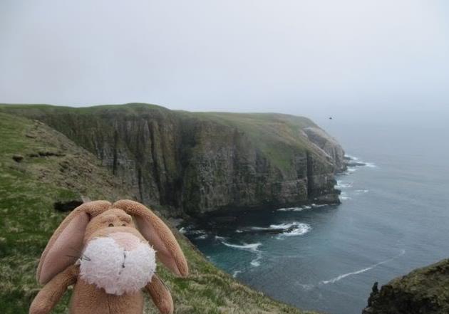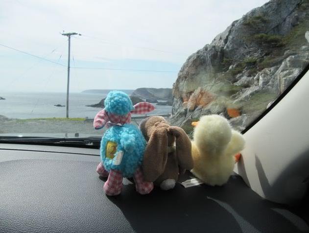 Hello from Bonavista, We were in Bonavista. On our way we stopped at a cliff, where puffins are living. They are so cute and funny. We saw a lot of them, sitting there and flying around, but they were far away. You can see the black and white dots on the photo behind me : there were the puffins.