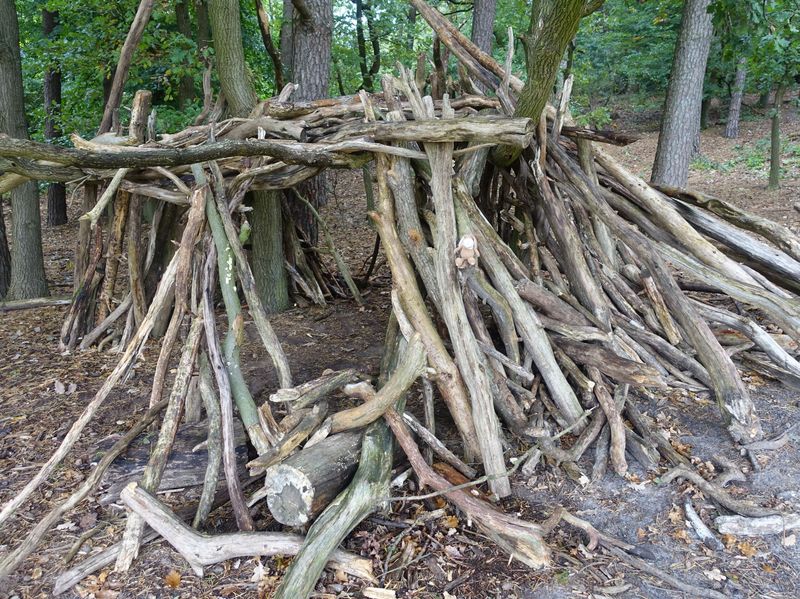 Jemand hat eine Art Holzunterschlupf gebaut.